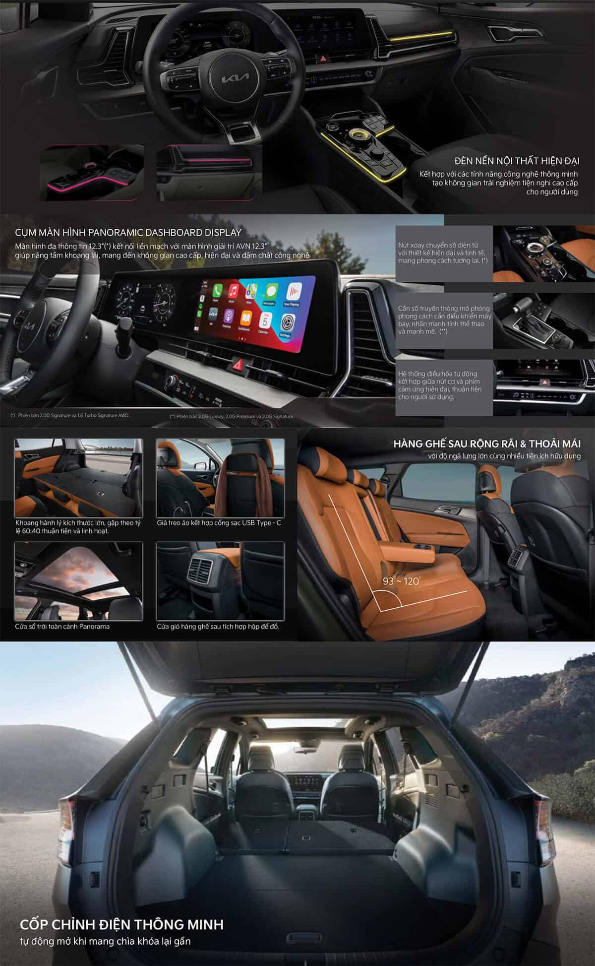 Những tiện nghi khác trên KIA Sportage 2022 gồm: Nút bấm khởi động & chìa khóa thông minh, sưởi/làm mát ghế trước, cửa sổ trời toàn cảnh trên các bản cao cấp, gương chống chói tự động, điều hòa tự động, phanh tay điện tử, đèn LED nội thất trên & cần số điện tử trên 4 bản cao cấp,.